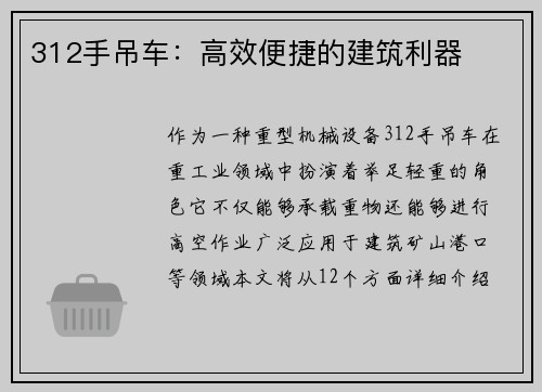 作为一种重型机械设备,312手吊车在重工业领域中扮演着举足轻重的角色。它不仅能够承载重物,还能够进行高空作业,广泛应用于建筑、矿山、港口等领域。本文将从12个方面详细介绍312手吊车的特点和应用。